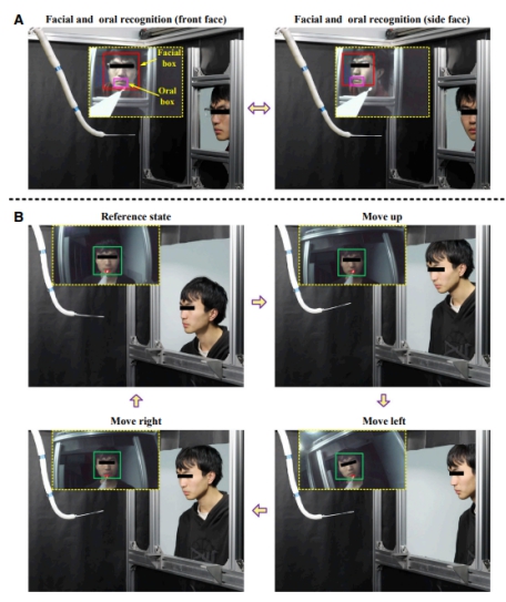 为了快速实现软体机械臂的介入操作,研究人员同时开发了人体器官的识别和跟踪系统,确保软体机械臂可准确识别目标器官并及时跟踪其位置。以人体嘴部为例,人体器官识别系统可准确捕捉人体脸部和嘴部的位置,无论头部是处于旋转状态还是平行平移状态。在此基础上,研究人员开发了人体器官实时跟踪系统,可以自动实时跟踪和定位处于移动状态的人体器官。自动化的识别和跟踪系统可以在很大程度上释放操作人员的手部操作压力。