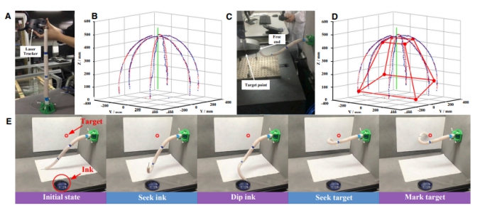 由于软体机械臂具有连续变形和无限自由度的理想特性,因此需要定量确定在工作过程中的安全性,根据D-H坐标系方法建立相应的的运动学模型,对软体机械臂的理论定位和姿态进行了预测并与实际比较,发现与实际情况相当一致。通过激光跟踪器ION(FARO)记录软机械手尖端的轮廓包络测量了软体机械臂的工作空间,软体机械臂的最大操作空间可以认为是一个由六条曲线裹的近似半椭圆体。通过针对预定对象进一步研究操作准确性。通过在尖端安装笔头,遥控软体机械臂以寻找并蘸取墨水,然后寻找和标记具有不同直径的预先绘制的目标圆圈,当目标圆直径在3cm左右时,操作精度可控制在100%。