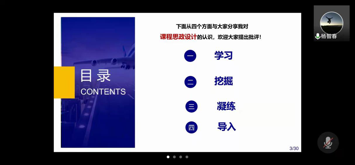 杨智春教授是教育部高等学校航空航天类专业教学指导委员会副主任委员、陕西省课程思政示范课程《结构振动模态分析》的主讲教师。杨智春教授结合自己的课程思政教学实践经验,以“浅谈课程思政设计”为题,讲述了课程思政的重要意义,从学习、挖掘、凝练和导入四个方面详细讲授了专业课课程思政设计的心得体会,报告层次清晰,内容丰富。报告结束后,老师们分别就课程思政案例素材模板、课程思政案例凝练导入、“大国三航”校企协同课程思政育人、主机厂所专家进专业课堂等方面开展了讨论交流。