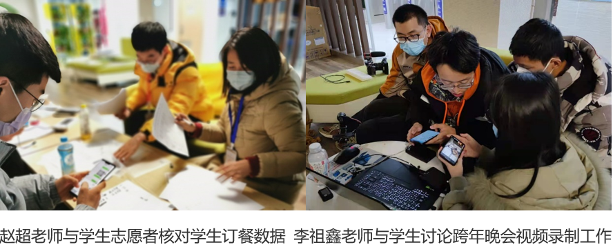学院党委副书记赵超老师和学生工作组的李祖鑫、李文丰、张春林三位辅导员长期驻扎在长安校区,承担起海天苑2期ABC座及学院其他学生所在楼宇近三千名同学的日常用餐和物资保障工作。从每天早晨七点到晚上十二点,全天候值守在学生宿舍楼,深入学生内部,建设了以“栋长—层长—舍长”为组织架构的日常管理体系,并征集志愿者建立起了整栋宿舍楼的订餐、送餐、核酸检测、物资发放、垃圾清理等模块的工作支持系统,同时,还充分发动楼内学生积极参与,在24小时之内策划呈现了一场精彩的线上跨年晚会。