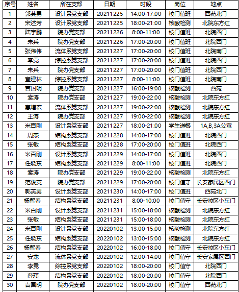 12月23日以来,西安市防疫措施连续升级,全市各单位实行封闭管理。疫情就是命令,防控就是责任。beats365官网及时召开党委会布置党员志愿抗疫工作,教工党支部积极动员,教职工积极响应学校倡议,在关键时刻挺身而出,主动到所在校区在线报名,参加校门值守、全员核酸检测信息核录、学生宿舍楼送餐等志愿服务活动,为疫情防控助力尽责。