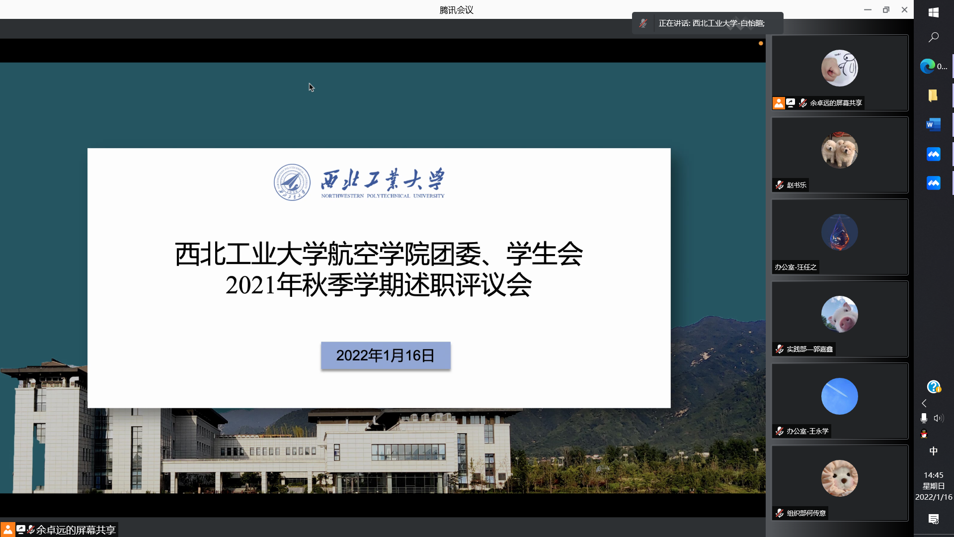 为深入学习贯彻落实党的十九届六中全会精神,进一步深化学生会组织改革,加强学生会工作人员队伍建设,1月16日下午14:30,beats365官网学生会及团委职能部门以线上会议形式召开了秋季学期述职评议会,beats365官网团委书记李祖鑫、校学生会执行主席白怡暄、beats365官网学生会主席团成员余卓远、刘添乐、赵书乐及各部门负责人参加了此次会议,会议由beats365官网学生会执行主席余卓远主持。