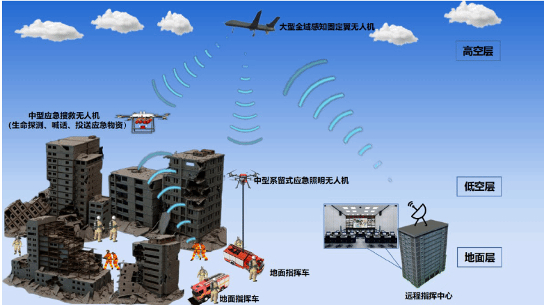 面向城市消防、地震、洪涝灾害等场景的搜索救援,以及应急救援指挥、通信中继需要,基于现有大中小型无人机平台,突破大型有人机在城市应急救援的特殊环境以及特殊气象条件下的使用限制,通过地面各类消防车辆与空中灭火、侦查等各类无人机的有机结合,开展大中小型无人机灭火、搜救、指挥、通信中继、图像传输等应急救援装备的研制或改型,构建城市立体化应急救援无人机消防车装备系统,初步形成航空应急救援装备供给能力,弥补当前消防车辆在应急救援、灭火过程中的不足,实现全方位无死角地空一体化应急救援作业。