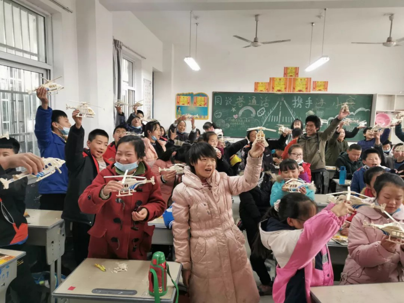 紧张而忙碌的上午结束之后,经过短暂的休整,志愿者们再一次进入班级,带领热情的孩子们进行了科技感满满的实践环节。志愿者们根据不同年级组设计了不同的实践活动,带领低年级的小朋友叠纸飞机、组装木质航模,高年级的小朋友则动手制作了水火箭与简易纸杯飞机。虽然活动内容各有不同,但小朋友们都从丰富多彩的实践中获得了快乐,提高了动手能力,领悟到了科学的魅力。