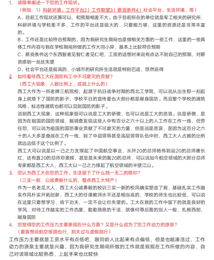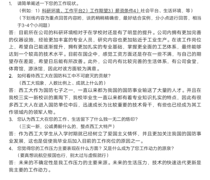 采访问题均围绕课题——工大校友工作现状调研,实践队从科研环境、工作平台、工作期望、薪资条件四个方面询问了校友们的工作情况,校友们就如何看待西工大在国防科工中不可磨灭的贡献说出了自己的观点,也简单的谈了西工大在他们工作、生活中留下的独一无二的烙印。