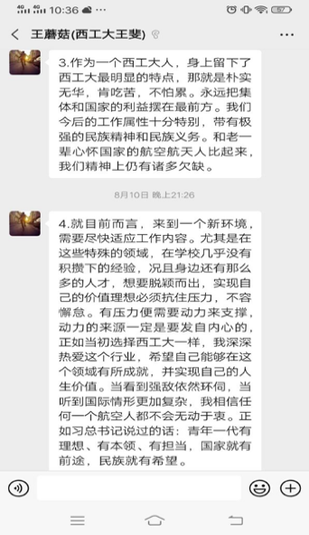 从线上采访中可以看到:从学校走入工作岗位,无论是科研环境还是科研资源都有了较大程度的改善,并且学校所学的知识在工作中也能够得到充分地利用,过渡环节较为轻松。同时在工作中,西工大效应也被体现的淋漓尽致,从最基础的研究员到总师,每个岗位都有着西工大人不灭的身影。在有许多校友的地方工作,是一种多么亲切的感受。谈到西工大给予学子的人生财富,校友都不约而同地提到了西工大三实一新的校训与坚韧朴素的作风。正是这种踏实朴素的精神才能培养出越来越多的航空人才,才能使工大学子在未来走得越来越远。这是烙印在工大学子骨子里的精神,是伴随一生的宝贵财富与永远向前的不竭动力。