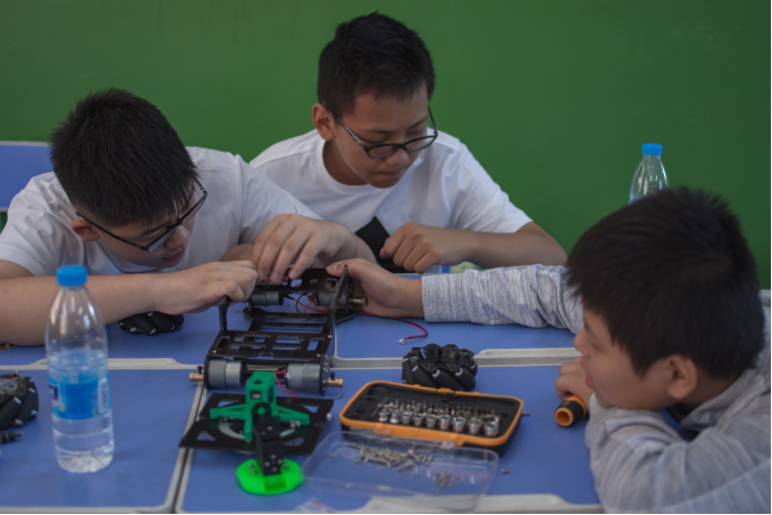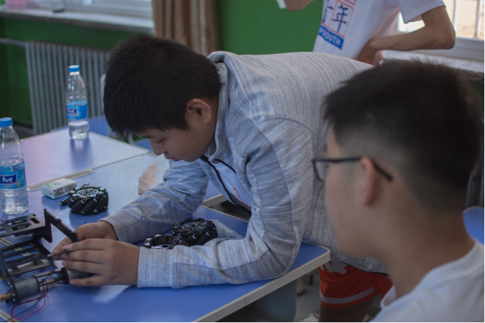 课后,教学小分队在与学生交流的过程中发现,同学们对昨天装配的零件不太熟悉,因此教学小分队决定在课程中加入小车底盘配件原理的讲解。讲解过程中,详细地为同学们讲解螺钉螺母等的规格、小车矿界玻璃纤维材质的制作方法、麦克纳姆轮的工作原理、减速电机的结构以及Arduino软硬件开发环境。