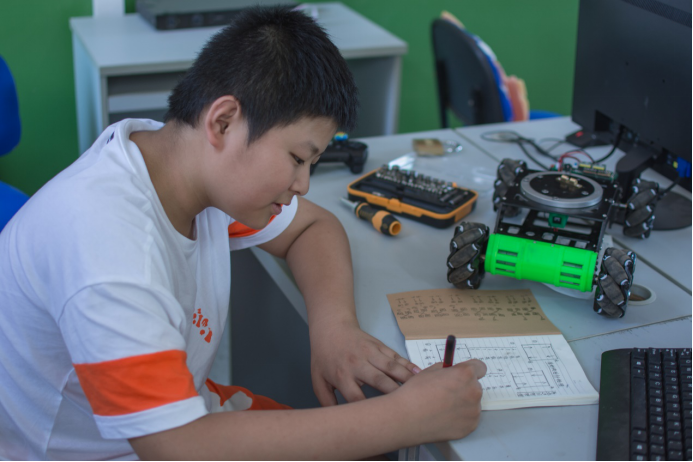 下午,在给学生强调用电安全和接线步骤之后,教学小分队带领同学们前往微机教室进行编程实践教学。同学们通过编程学习,可以使小车实现基本移动。编程学习是机器人学习的重要部分,为了使低年级同学更直接地了解编程、学习编程,教学小分队采取逐步示范地教学方法,一步一步向学生示范模块化编程的流程,保证同学们都听得明白、学得透彻,维持他们对小车制作的兴趣以及对探索知识的热情。
