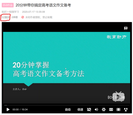 我们的第一个教育助力视频,一天准备内容,制作讲课PPT,一天的修改完善,之后发表。这个作文备考讲解,显得有些特立独行,不单单讲方法,还包含了讲者孙sir的6篇原创高分作文讲解,以及一篇大神作文欣赏。截至目前,这个《20分钟带你搞定高考语文作文备考》的视频在B站的播放量已经突破50!对于初次发布视频的我们真是莫大的鼓舞。接下来,那就撸起袖子加油干。
