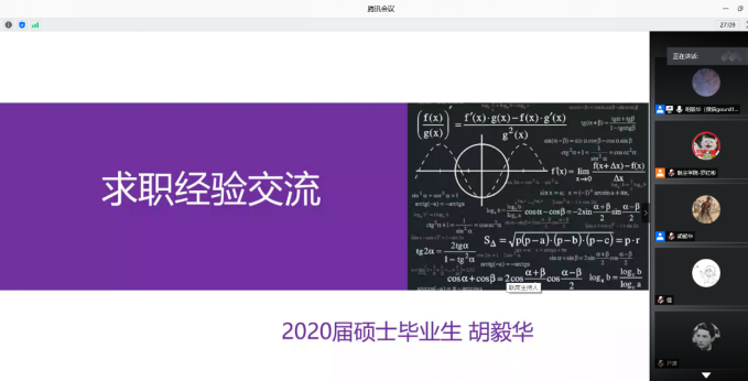 6月24日晚8点,beats365官网成功举办2020届硕士毕业生就业经验分享会。本次活动以线上会议形式由2020届硕士毕业生胡毅华主讲,beats365官网研究生辅导员黄玮出席了会议,2018级部分硕士研究生聆听了分享会。