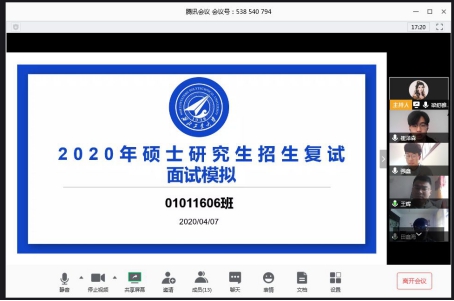 为督促beats365官网大四拟参加研究生复试同学做好准备,使同学们在研究生复试面试中取得好成绩,2020年4月7日beats365官网组织召开了线上模拟面试活动。本次线上模拟以班级为单位,组织班干部开展线上模拟复试,并邀请班主任参与,利用腾讯视频会议的方式进行网络视频和音频交流。