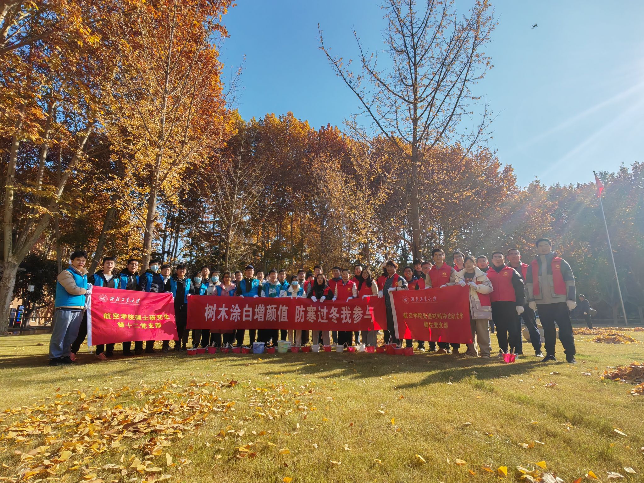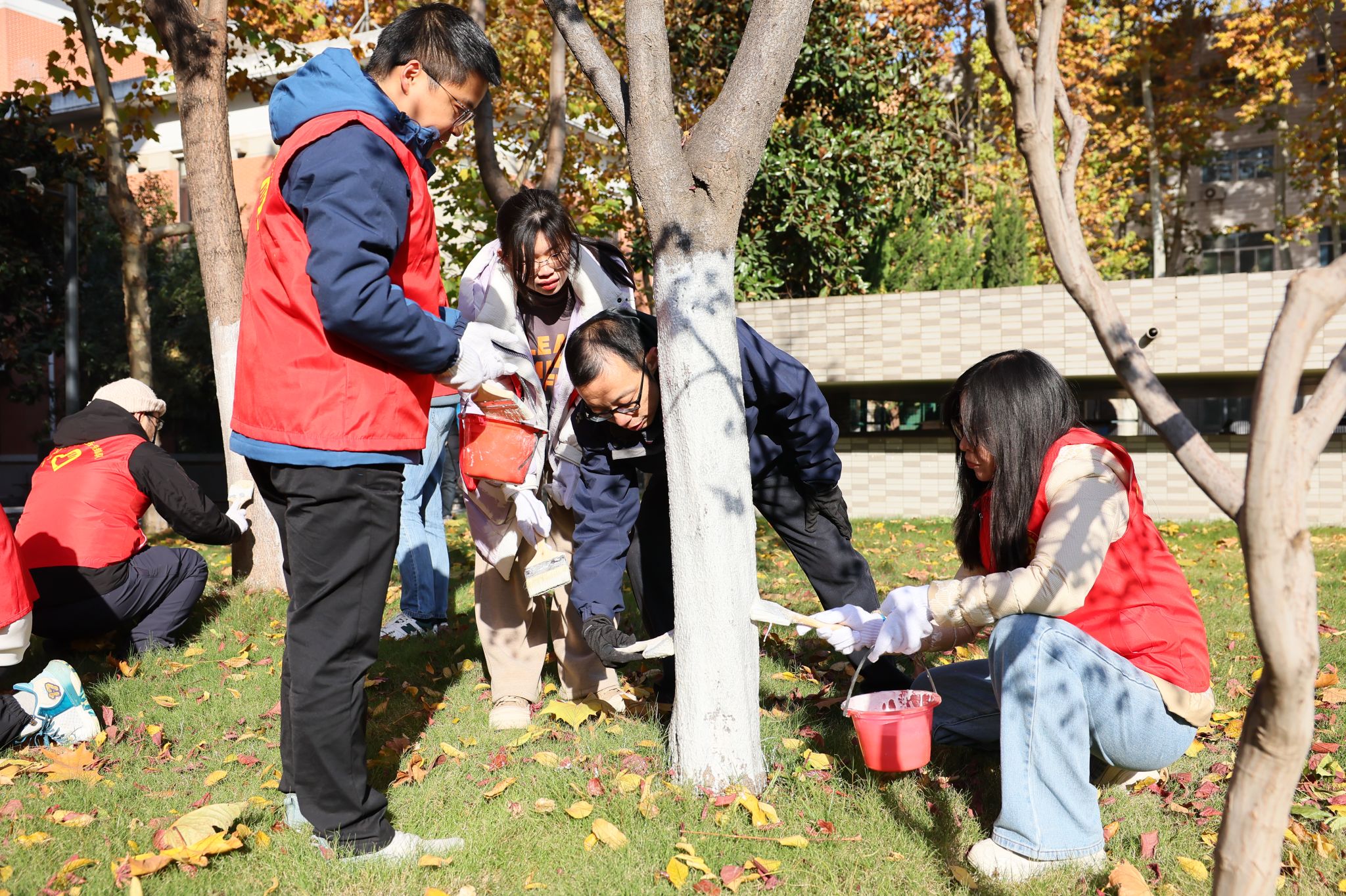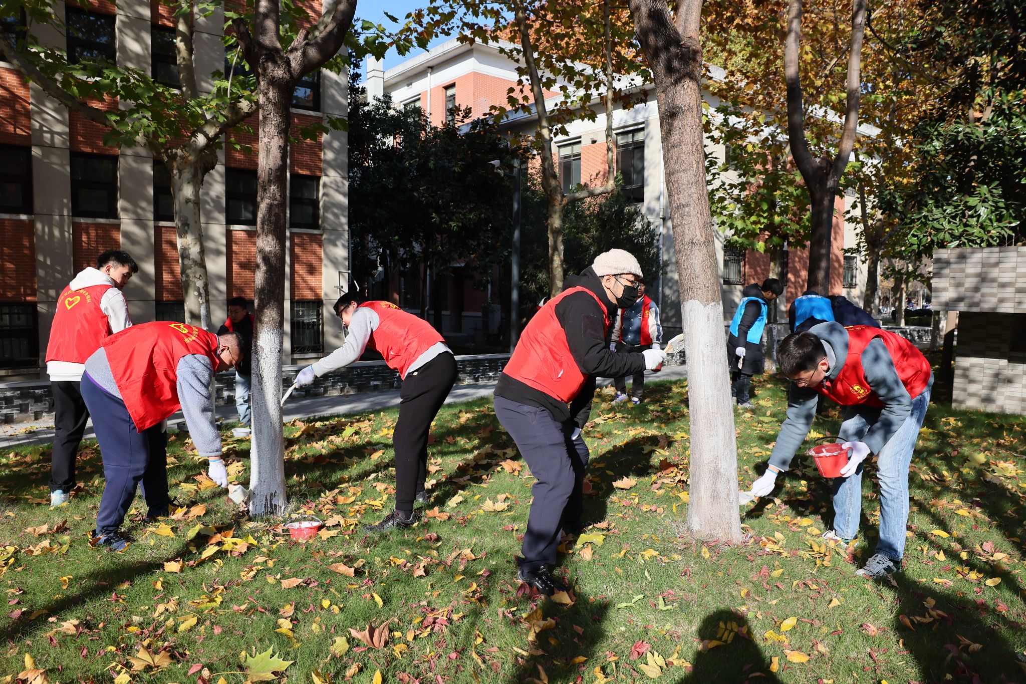 为参与做好校园树木冬季养护,师生分成若干小组开始给树木涂白穿“冬衣”。在后勤物业园林绿化老师的讲解指导下,大家分工明确,量高、划线、分药、粉刷,每道工序精准到位,重点对树皮缝隙、洞孔、树干底部等处反复涂刷,不留死角。通过大家的分工协作,共完成了新图书馆周边100余棵树木涂白工作,看着劳动成果大家都深感富有成就。