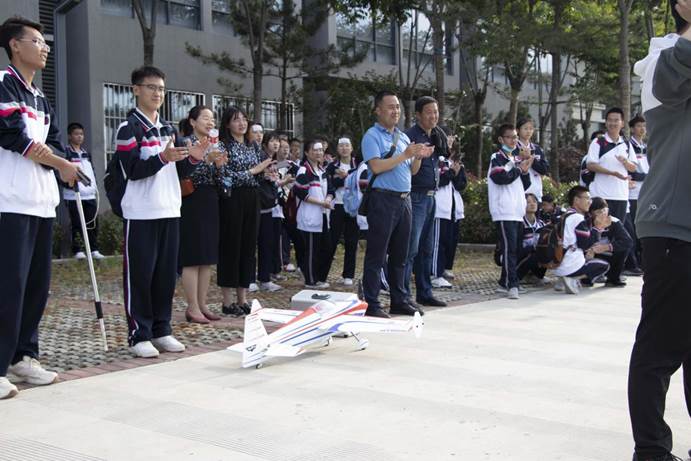 最后大家来到了海天苑旁的草坪上,一起观看航模队的飞行表演。四架航模飞机在航模队飞手的操控下闪转腾挪,做出了一个个高难度动作,加之航模奇特而漂亮的外形,孩子们啧啧称奇。飞机降落后孩子们进行了近距离触摸与观察,很多同学表示:“将来也想拥有一架这样的航模!”