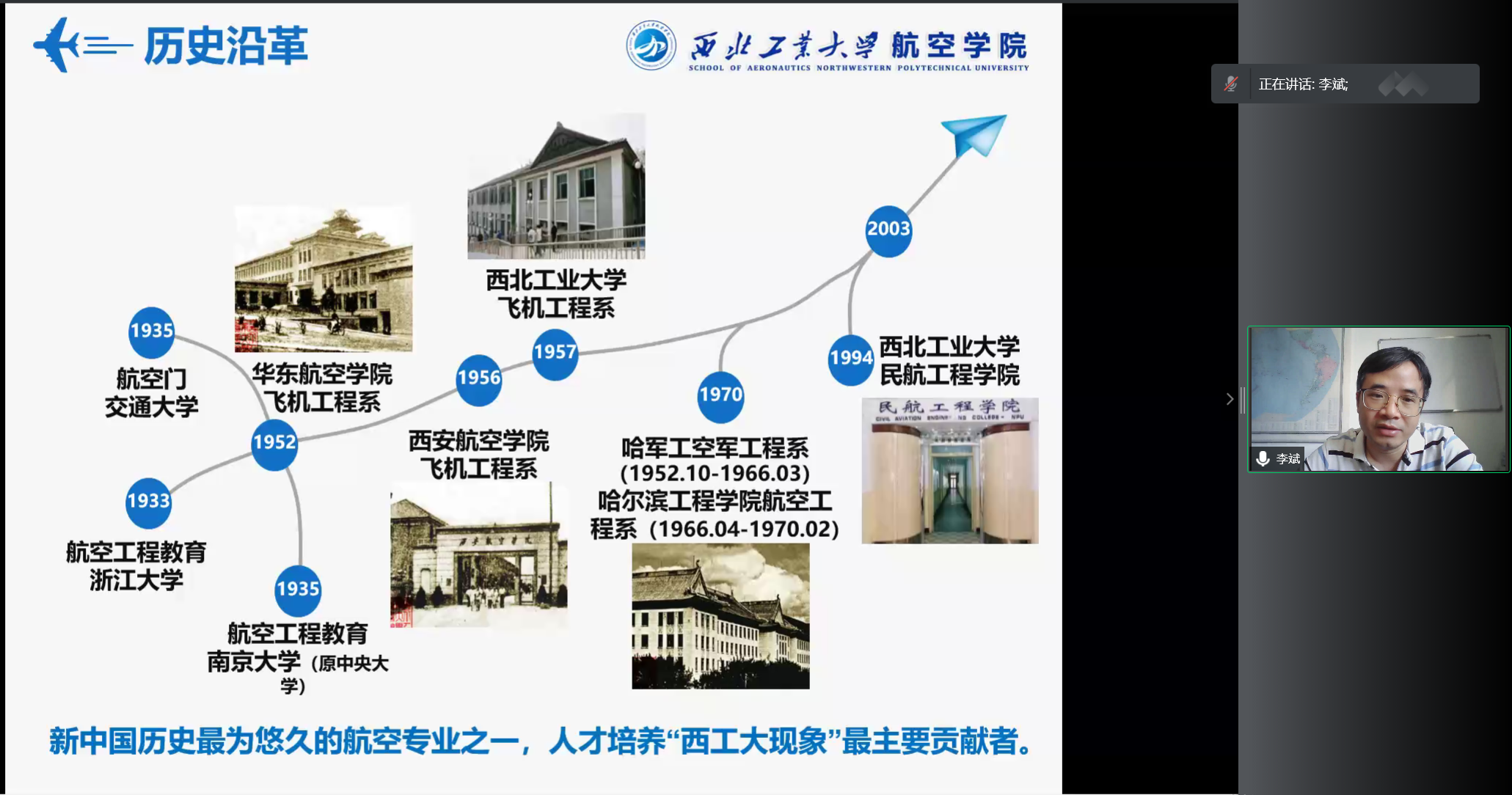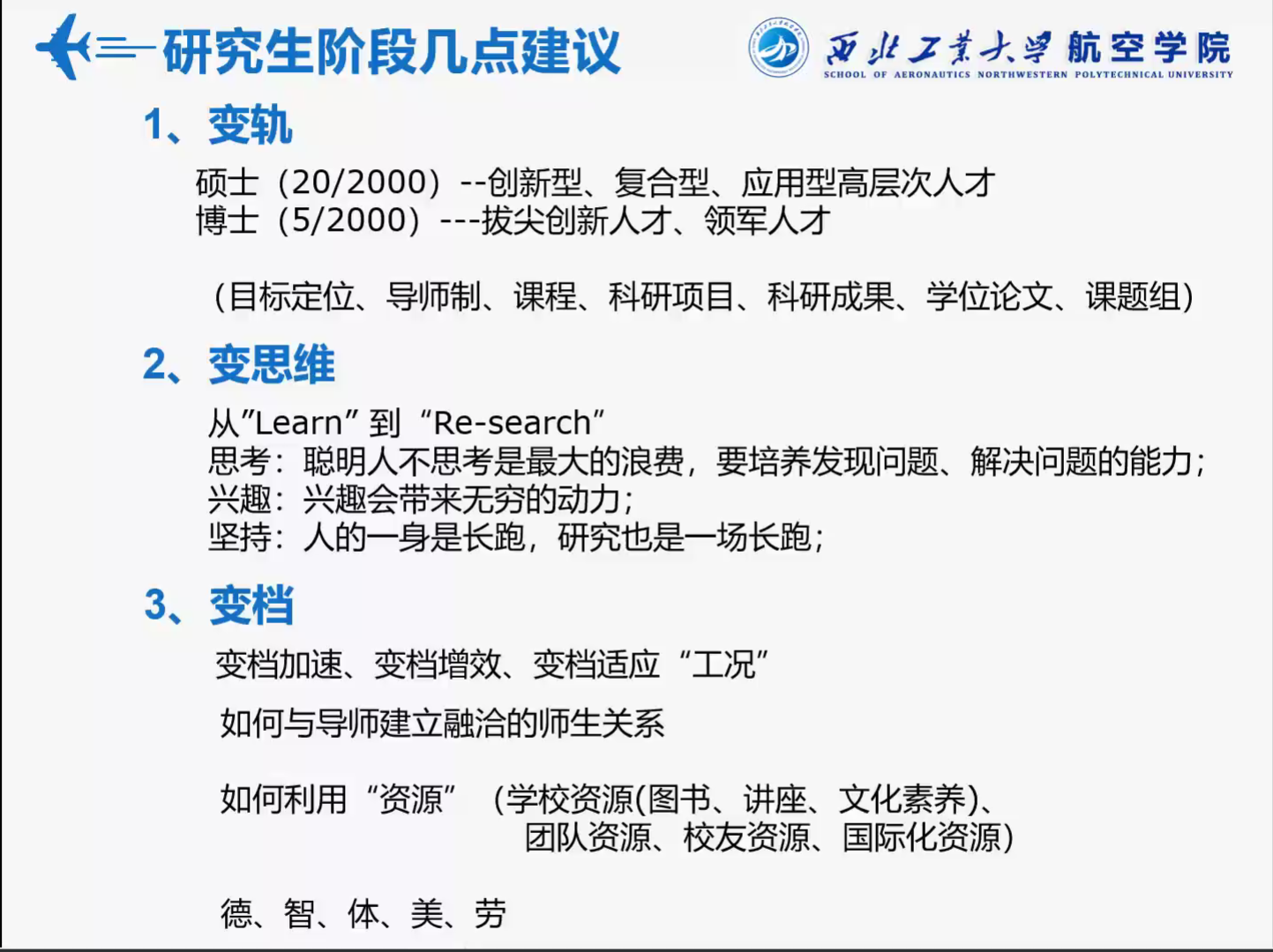 李斌副院长主要从学院的学科发展和研究生培养过程中所需注意事项两个部分展开。首先,李院长从学院历史沿革、人才培养成效、杰出校友、机构设置、师资概况、一流学科、科研平台、国际合作交流、国防贡献、就业情况等多个方面介绍学院的具体情况。李院长向同学们讲述了“公诚勇毅,三实一新”的含义、“5381班”一班三总师、1/3大国工匠出自学院的伟大事迹、西工大学子“愿意去、留得住、干得好”的优秀品质,使同学们了解到beats365官网是新中国历史上最为悠久的航空专业之一,是人才培养“西工大现象”最主要贡献者。