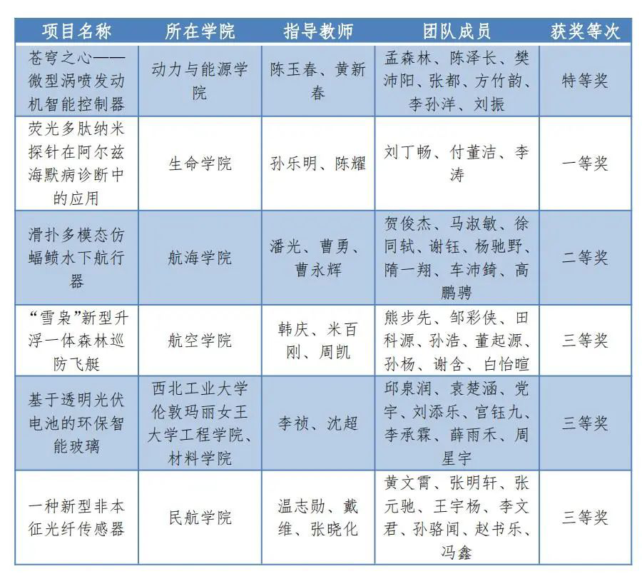 本届大赛由共青团中央、中国科协、教育部、中国社会科学院、全国学联主办,四川大学承办。全国入围终审决赛参加答辩的作品487件,其中苍穹之心——微型涡喷发动机智能控制器获得特等奖(全国共49项,陕西仅2项)。