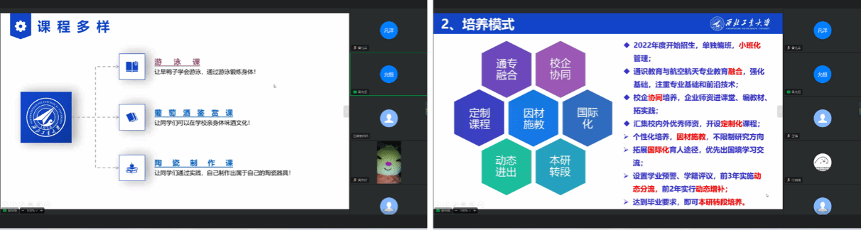会议伊始,吴允恒首先播放了西工大长安校区的航拍视频与学校招生宣传片。随后,他介绍了西工大的三航特色、屡次被美国“拉黑”、是我国总师摇篮等,分享了学校的“大学生烹饪课”、“葡萄酒鉴赏课”等特色课程的视频和体会,以及大学生创新创业活动、毕业就业情况等,使得同学们对西工大的办学特色有所了解,切实体会到在西工大的校园生活以及未来的就业前景。