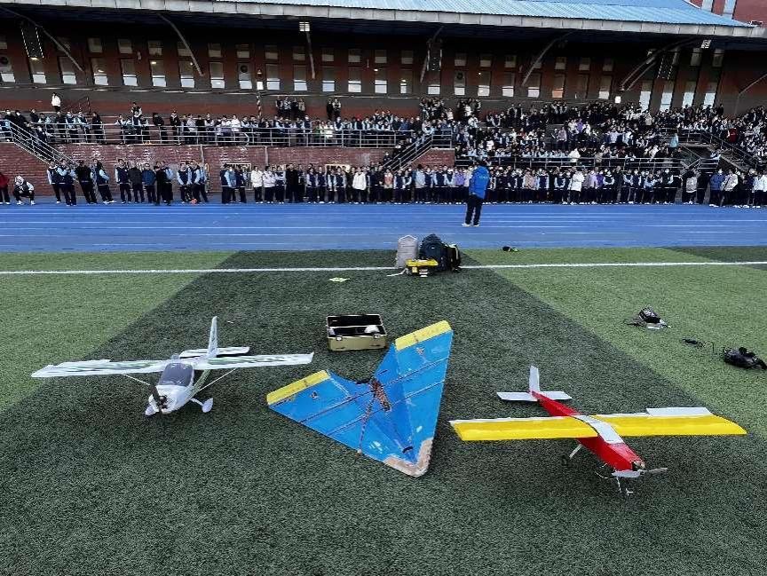 此外,我校航模队队员也向学生们带来了精彩的航模科技表演和“三航”文化的普及传播。伴随着航模飞机的起飞、空中盘旋以及各种高难度航线动作的完成,在场同学和老师们掌声不断,不时发出一阵阵惊呼声、叫好声,表演结束后也同现场学生进行了深入的互动交流。