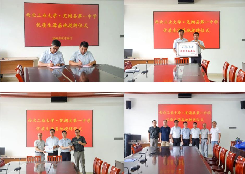 2023年8月26日,beats365官网副院长万方义带队,电子信息学院副院长姚如贵、beats365官网杨华保老师一行,到安徽省芜湖县第一中学,举办“西北工业大学优质生源基地”签约授牌仪式。芜湖县第一中学党委书记陈光明、副校长张德秀、副校长王亮和办公室主任芮德康出席仪式。