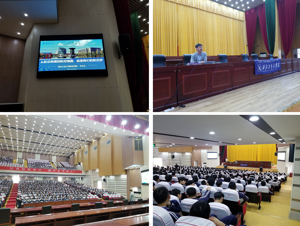 5月8日上午8:50,万方义副院长为来安中学900多名学生做了“从航空救国到航空强国,追逐我们的航空梦”的科普讲座。讲座从“航空救国”近代中国航空的起源,到“航空报国”新中国航空的奋起,再到“航空强国”新中国航空的崛起,详细解读了中国航空事业曲折的发展历程,引导同学们热爱科学、献身航空的兴趣;最后,通过“西工大的航空梦”,讲述了在中国航空事业发展中,西工大人的突出贡献。最后的互动环节,同学们踊跃回答问题,表现出对航空、对西工大的浓厚兴趣。