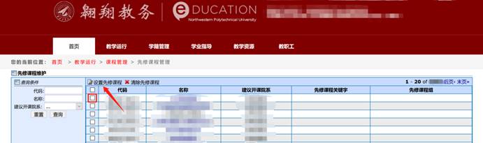 教务处组织专家对开课单位提交的申请表1或申请表2与课程教学大纲进行评审。评审通过,教务处在教务系统对新开课程进行入库处理后,开课单位教秘老师登录翱翔门户-教务系统-课程管理-课程教学大纲上传,上传相应课程的电子版课程教学大纲,如图3所示。并设置相应先修课程,如图4所示;评审不通过,教务处将教务系统中的新开课申请退回到申请开课教师处,同时将纸质版申请材料退还至开课单位教秘老师处,教秘老师负责与申请新开课教师沟通,修改后重新提交。