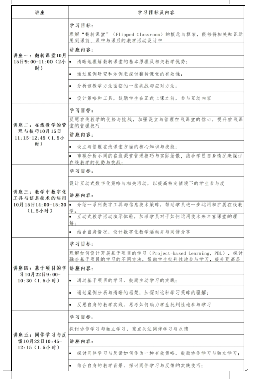 “在线教学法创新讲座”是由澳大利亚顶级名校阿德莱德大学设计的系列专题讲座。内容涵盖5大模块:翻转课堂、在线教学的管理与技巧、教学中数字化工具与信息技术的运用、基于项目的学习、同伴学习与反馈。