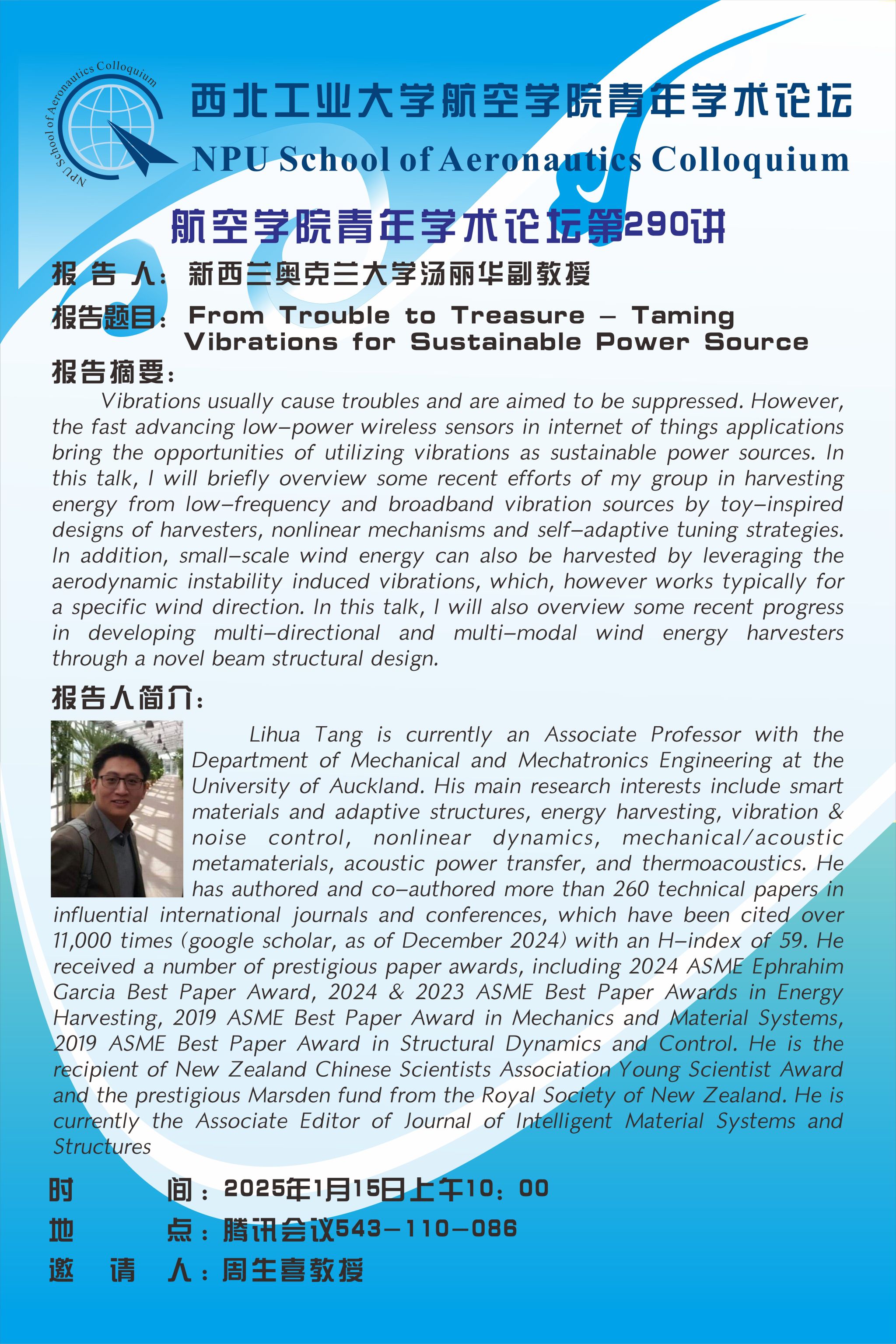 School of Aeronautics Colloquium No 290- Prof. Lihua Tang, Associate Professor, University of Auckland, New Zealand