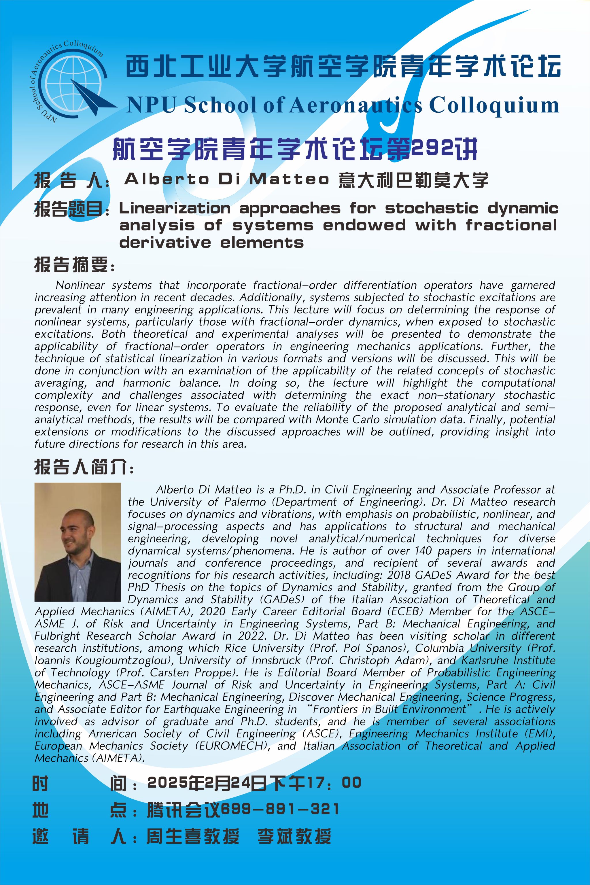 School of Aeronautics Colloquium No 292- Ph.D. Alberto Di Matteo, Ph.D, University of Palermo, Italy