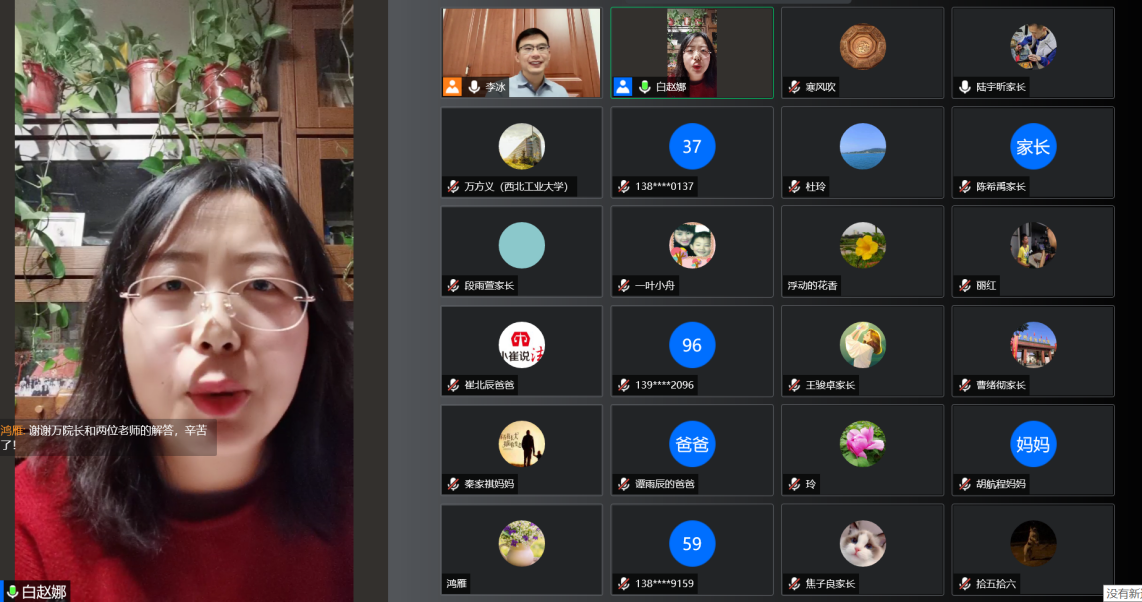 会议交流环节中,家长们非常积极主动地向三位老师询问学生学习思想生活状态,老师们轮流地耐心解答了家长的各种问题。家长们对三位老师的工作表示诚挚的敬意也愿意配合学院特殊时期对孩子给予更多的关心;肯定了此次班会的召开最大程度上打消了家长们的疑虑与担心,感谢学校及学院对学生的付出同时表达了对战胜疫情充满信心。