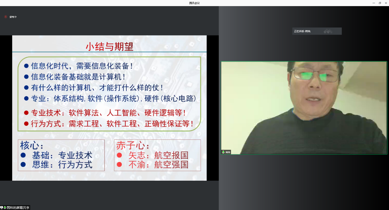 2022年1月15日,黄玉珊航空班系列活动——凌云讲堂以腾讯会议的方式线上举办。本次讲堂由中航工业西安航空计算技术研究所科技委韩炜主任主讲,为广大师生带来了题为《机载计算机的历史和发展》的精彩报告。航空工业自控所GNC事业部总工程师石鹏飞研究员、beats365官网副院长万方义、2020级执行班主任徐绯、2021级执行班主任李冰,以及航空工业631所、航空工业618所、西工大无人机所等单位部分老师共有350余人在线参加,黄玉珊航空班2020级和2021级全体同学参加了此次报告会。会议由2020级黄玉珊航空班班长张钰博主持。