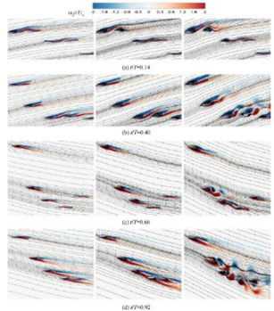 四个不同时刻下开缝翼布局的涡量云图与流线