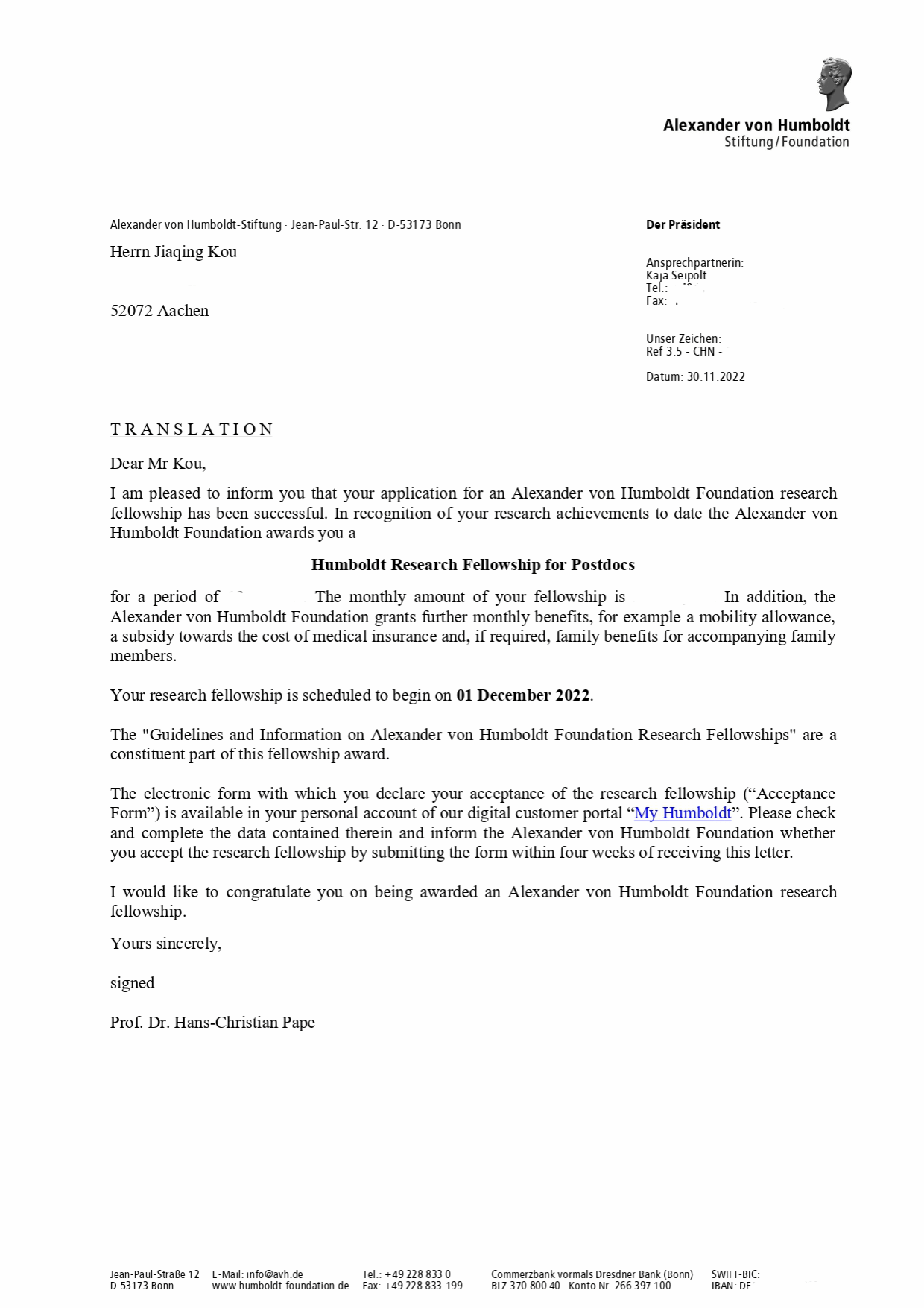 近期,2018届硕士毕业生寇家庆博士受到德国洪堡基金资助(Humboldt Research Fellowship for Postdoctoral Researcher),将在德国亚琛工业大学(RWTH Aachen University)开展数据驱动的非定常流体动力学建模研究,合作导师为空气动力学研究所(Institute of Aerodynamics, AIA)所长、APS Fellow Wolfgang Schröder教授。该研究所由著名空气动力学专家冯·卡门创建,长期从事实验和计算流体力学相关研究,在国际流体力学领域具有很高的声誉。