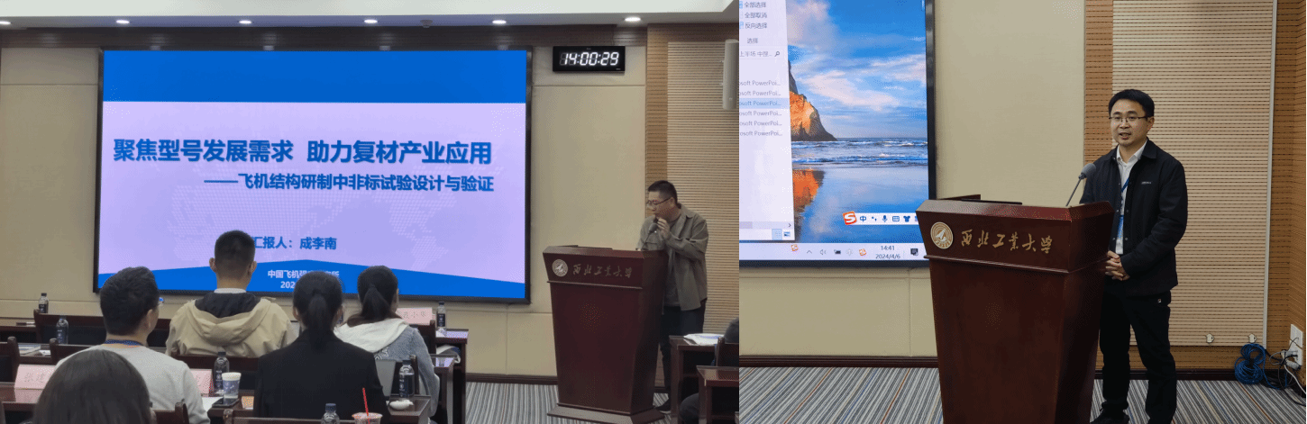 开幕式后,14位特邀报告人进行了大会交流。航空工业一飞院结构所所长、型号副总师、集团特级专家郭祥研究员作大会主旨报告,他以《碳纤维复合材料在航空器结构设计中的创新应用》为题,全面介绍了碳纤维复合材料在航空器结构设计、制造、耐久性等多方面的翔实的案例分析和未来的趋势方向。中国飞机强度研究所副总师、航空工业集团首席技术专家聂小华研究员作了题为《航空复合材料结构优化设计技术及软件研发》的报告,回顾了航空复合材料结构优化设计技术,从国产工业软件作为突破口,补齐短板,争做工业软件强国。