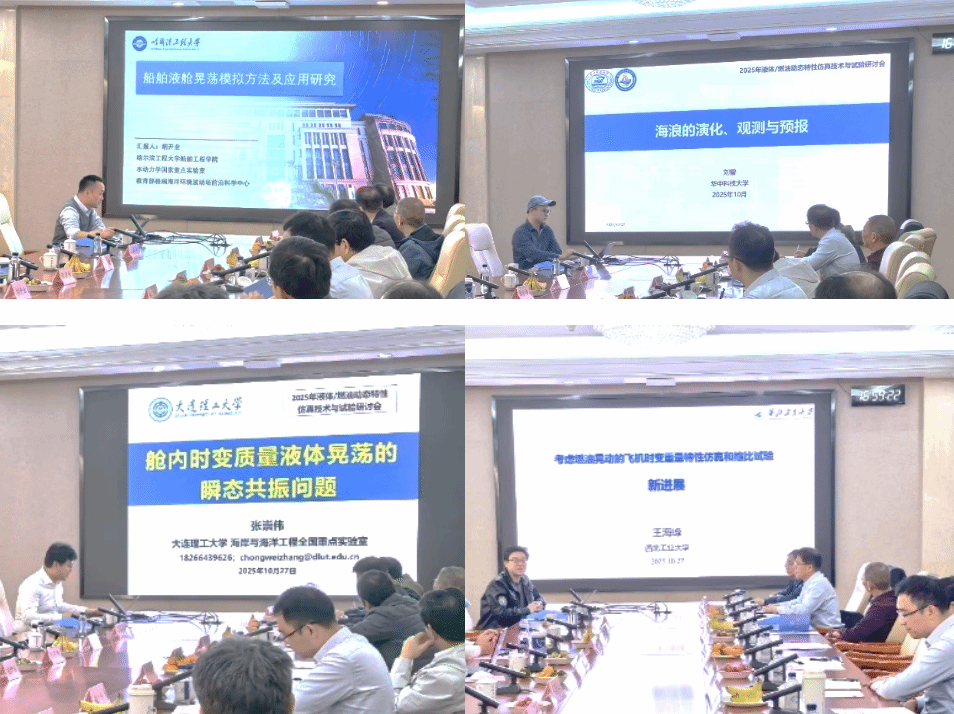 会议特邀四位专家学者,围绕船舶与航空领域共通的“液体晃动”主题作了前沿报告。哈尔滨工程大学船舶工程学院副院长胡开业教授聚焦于“船舶液舱晃荡的模拟方法及应用研究”;华中科技大学刘曾副教授深入讲解了“海浪的演化、观测与预报”的前沿动态;大连理工大学张崇伟副教授则围绕“舱内时变质量液体晃荡的瞬态共振问题”分享了最新研究成果;beats365官网王海峰副教授从工程应用出发,介绍了“考虑燃油晃动的飞机时变重量特性仿真和缩比试验新进展”。