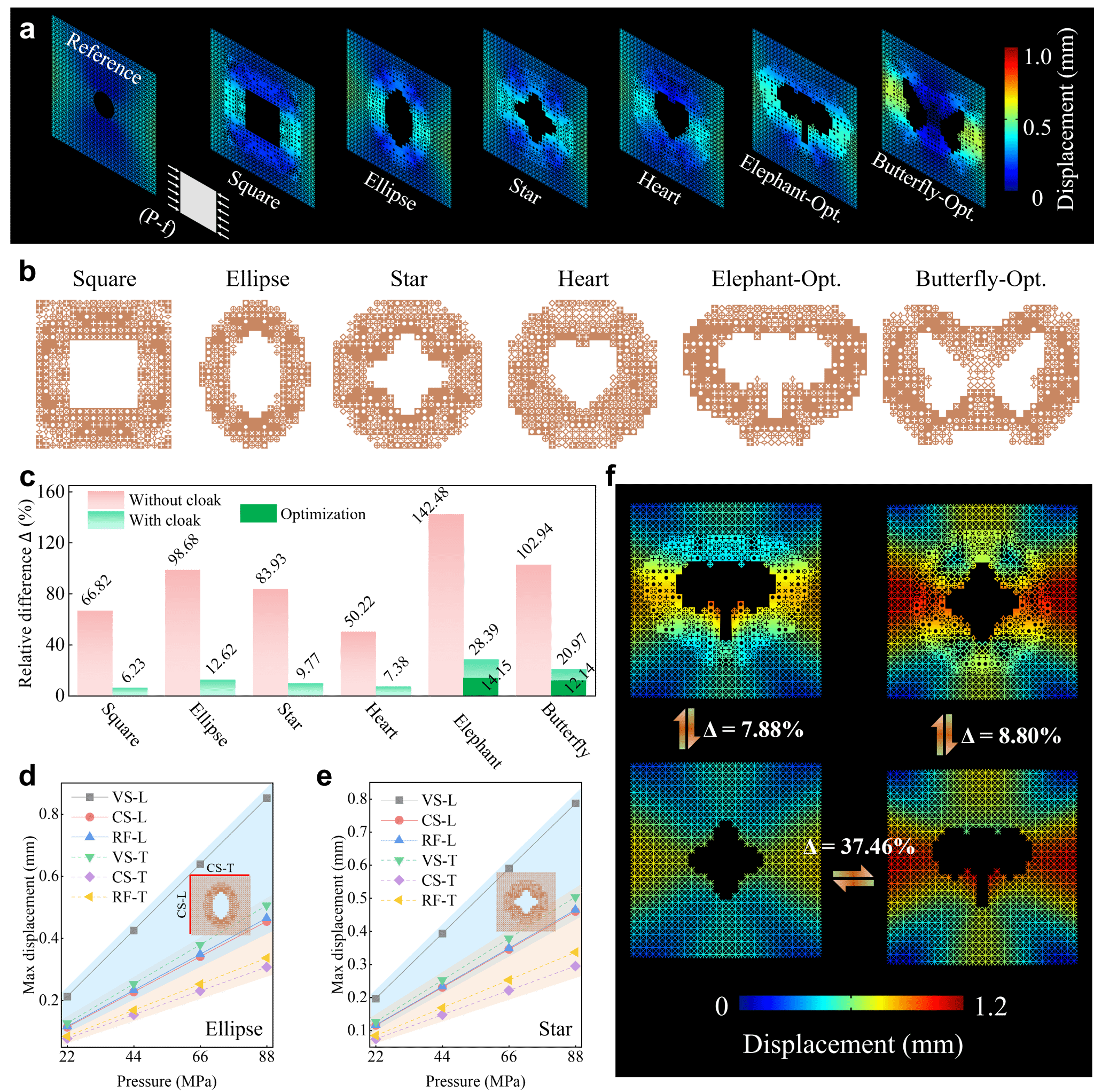 隐身与伪装技术在电磁、光学、声学等多个领域有着重要的战略地位。凭借这类技术,物体能够规避精准探测,进而达成隐藏自身或保护目标的目的。然而,静力学隐身的本质是应力-应变场的调控问题,其物理过程中并不存在可对波传播路径进行控制的机制,这就导致电磁、声学及热学斗篷设计中常用的“变换理论”,在应用于静力学隐身时会面临严苛约束,甚至出现数学层面的不可解困境。此外,由于力学响应需通过四阶张量表征,这对完美静力学隐身在理论层面上提出了极高要求:其微结构需同时具备各向异性、空间非均匀特性,甚至要求弹性模量或泊松比呈现“趋近于零”或“趋近于无穷”的奇异值。这种矛盾的性能需求,仿佛要让材料在力学世界中既实现“物理消失”,又具备“全能承载”的能力,显然超出了常规材料或结构的性能范畴。目前,具有这类“奇异特性”的材料在自然界中还未被发现,即便通过人工设计的超构材料,也难以在全参数范围内实现上述理想性能。