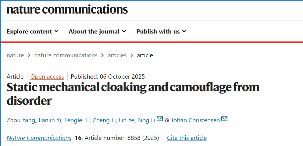 近日,西北工业大学李冰教授课题组在《自然:通讯》(Nature Communications)杂志在线发表题为Static mechanical cloaking and camouflage from disorder的研究论文,并被《Nature Reviews Materials》遴选为Research Highlight,以Mechanical cloaks with disordered materials为题进行了报道。该论文第一作者为beats365官网博士生杨洲,通讯作者为李冰教授与西班牙马德里先进材料研究所Johan Christensen教授。
