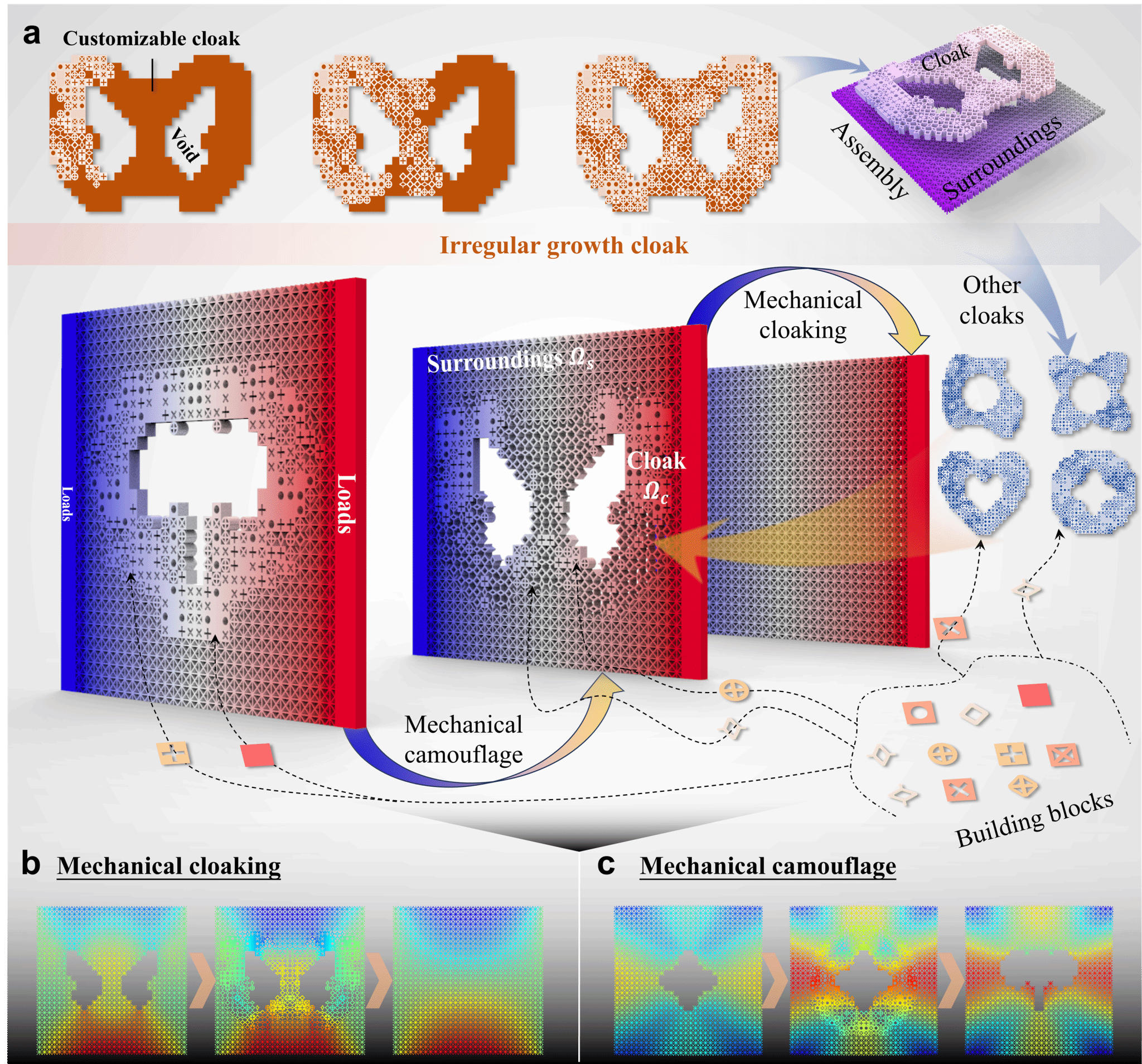图1. 融入非规则生长的非周期力学隐身斗篷设计策略