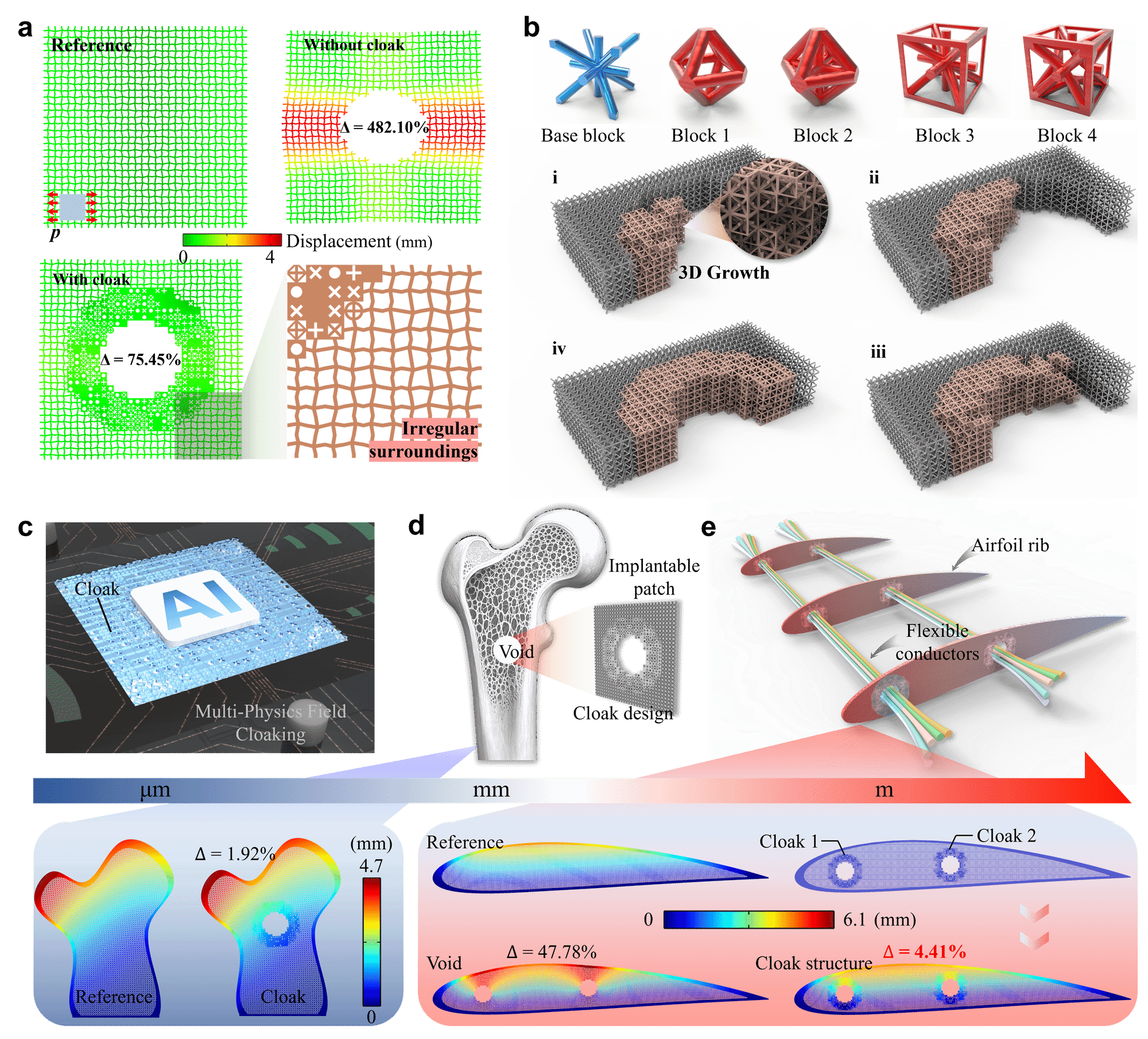 针对上述问题,研究团队提出了一种基于随机生长算法的静力学无序斗篷设计策略,无需构建精细的多模结构、也无需消耗大量计算和大样本数据库,仅通过有限数量的微结构单元,结合所提的刚度匹配邻接规则,即可在不同边界条件下稳定实现静力学隐身与伪装功能。所设计的无序斗篷结构对边界条件展现出优异的不敏感性,同时能够针对各类复杂缺陷结构开展静力学伪装设计,实现了不同复杂缺陷之间的相互伪装,显著提升了技术的适配性与实用性(图1)。此外,研究团队进一步证明了该设计策略可拓展至三维空间及弹性波动态调控,为更复杂场景下的隐身和伪装设计提供了新思路。该设计策略在芯片集成、航空结构开孔防护、虚拟触觉等方面具有重要的应用场景。
