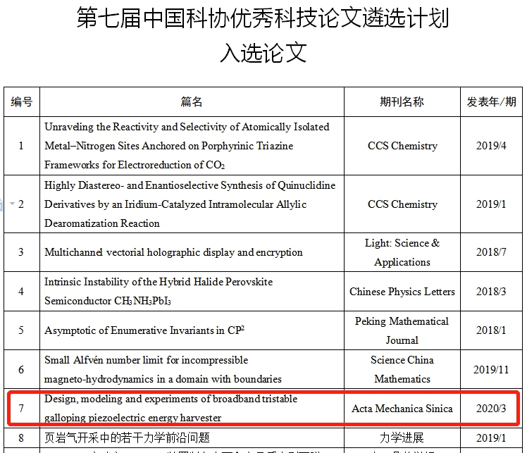 beats365官网周生喜教授作为通讯作者的研究论文为“Junlei Wang, Linfeng Geng, Shengxi Zhou*, Zhien Zhang, Zhihui Lai, Daniil Yurchenko. Design, modeling and experiments of broadband tristable galloping piezoelectric energy harvester [J]. Acta Mechanica Sinica, 2020, 36(3) 592-605”,该论文将驰振机理与多稳态机理相结合,设计了一种磁耦合式三稳态驰振压电能量俘获系统,在数值仿真和实验中均实现了在微弱风速下跨越多势阱的大幅值振动,具有较高的能量俘获效率,为高性能风致振动能量俘获系统的设计提供了新思路,在未来可用于设计户外传感器的微能源,用于智能无人值守环境状态监测、灾难性事故的预报等。此外,该论文也入选了2020年度Springer Nature中国作者年度高影响力研究精选(工程学)。