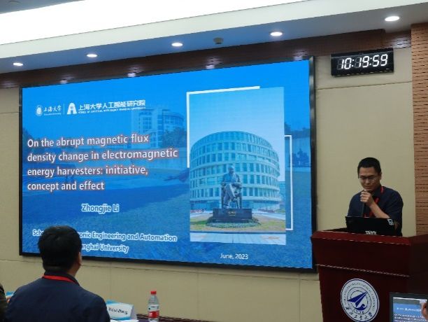 深圳大学赖志慧副教授介绍了一种新型混合振动冲击电磁介质能量俘获器,将该能量俘获器嵌入到摆锤结构中进而形成基于摆锤的减振俘能系统,同时说明了其物理模型,并基于非保守系统的欧拉-拉格朗日方程推导了涉及动力学和电气部分的控制方程。上海大学李忠杰副教授介绍了突变磁场分布的工作,例如结构、机电变换及其对能量俘获系统发电量的影响,该研究中极小型能量俘获系统也可以在极低的频激励下产生较高的输出功率。