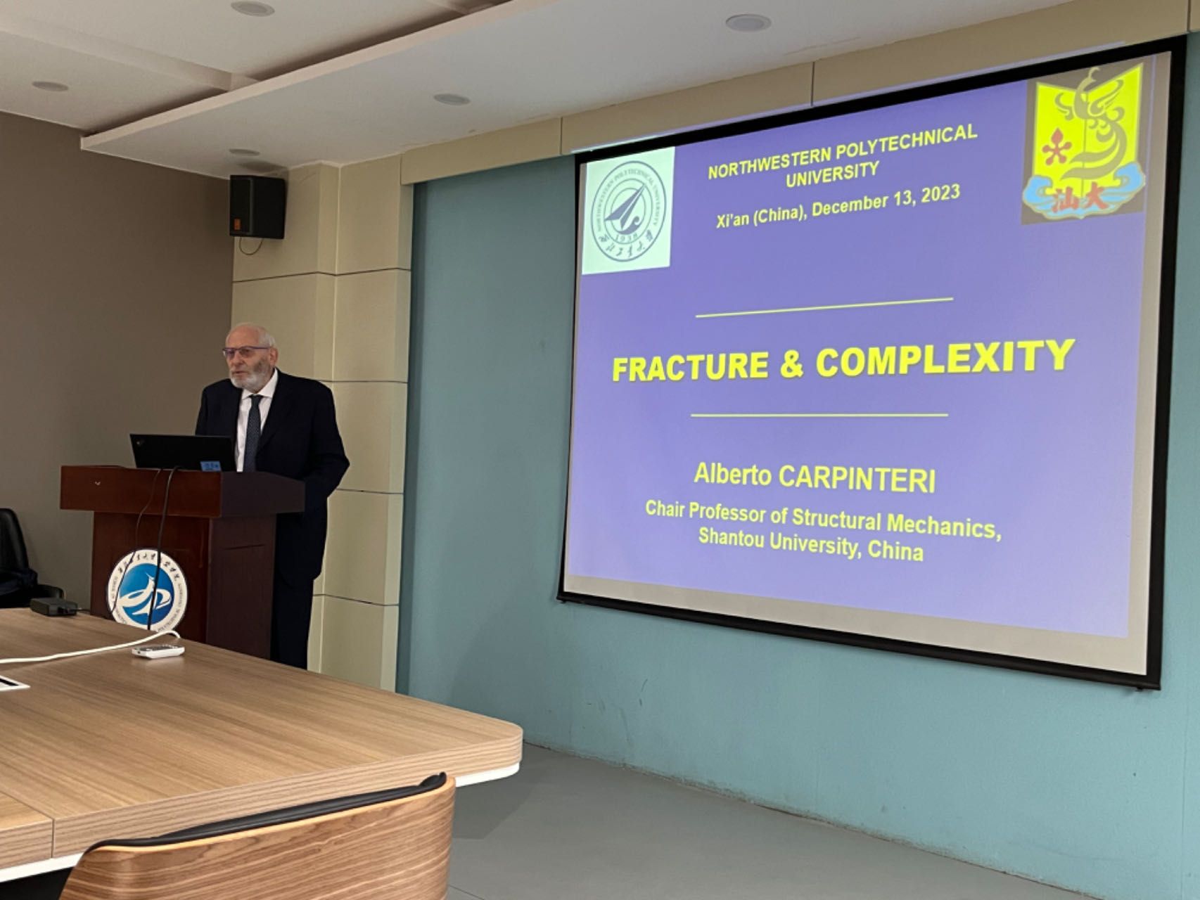 会议期间,阿尔贝托·卡尔潘蒂尼院士受邀作客西北工业大学翱翔灵犀学术殿堂,在航空楼A706为beats365官网师生作题为“断裂与复杂性”的学术报告,本次报告由周生喜教授主持。阿尔贝托·卡尔潘蒂尼院士围绕规模效应、René Thom突变理论、本构关系和分形几何学等方面的知识,为师生进行了深入浅出的讲解。本次学术报告会进一步拓宽了师生们的学术视野,为未来的科研和学术道路打下了坚实的基础。