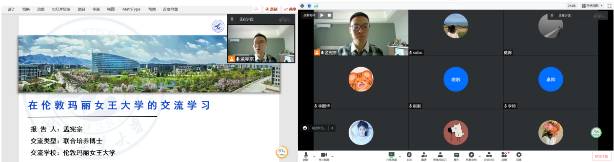 疫情下的留学生活有挑战,但也是一段特殊的宝贵经历,它将我从昔日的生活中抽离出来,站在新的角度重新思考以前认为理所应当的事情,省思科研、生活、自我成长的问题。留学的这段经历,对我来说不单单是科研上的学习与探索,也是自我的反思与成长。返校后,我给beats365官网师生做了汇报,将我博士联培期间学习、科研、生活各方面的经验、收获做了全面地分享。